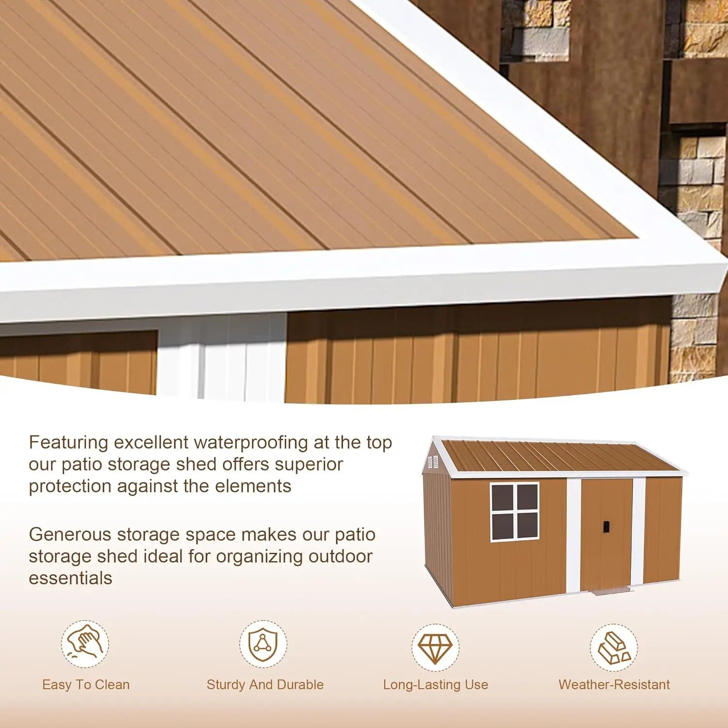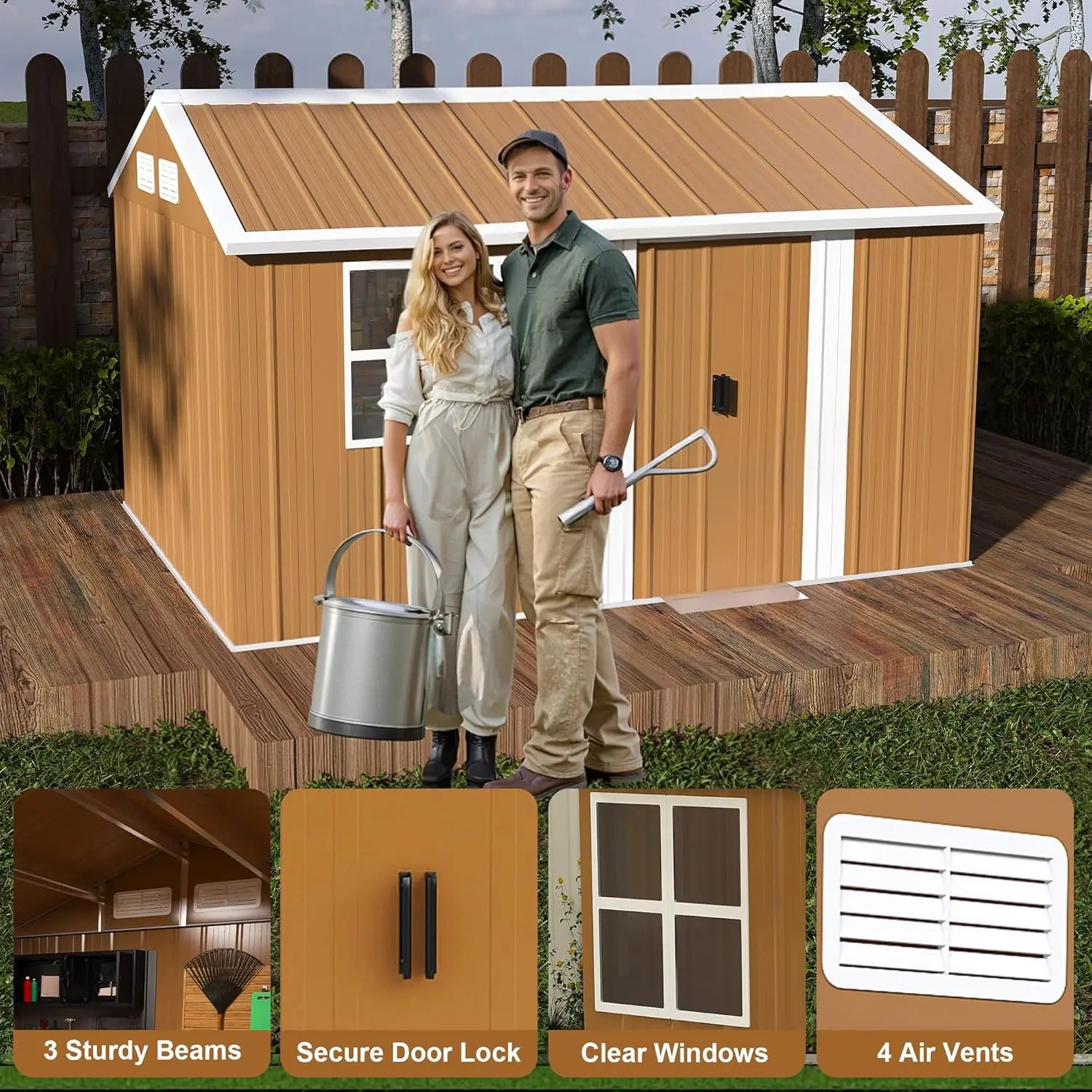 [Generous Storage Space] This 10' x 12' garden storage shed is an ideal solution for your garden storage problem, suitable for small gardens or areas with limited space,Durable construction with sturdy steel material makes this storage shed last long and UV-resistant,The inclined slope roof adds extra storage and prevents rainwater from gathering .This outdoor storage shed has the perfect size for storing your garden tools. Perfect for your garden, backyard, lawn, and any outdoor space you want.