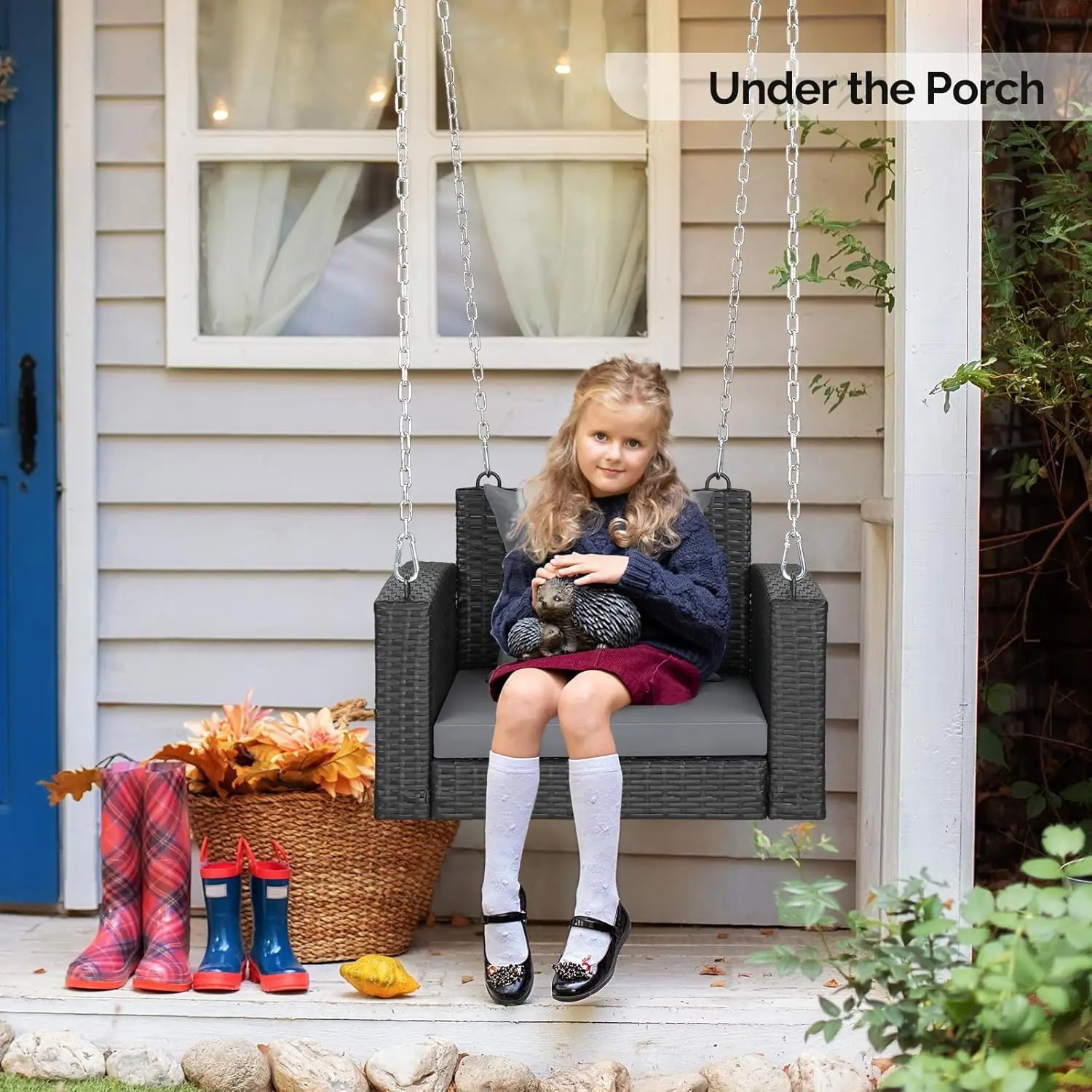 2.2 FT 1-Person Use Rattan Porch Swing Outdoor Support 440 LBS with Cushions & Adjustable Chains, Patio Wicker Swing Bench Chair for Garden, Yard, Lawn, Tree, Black