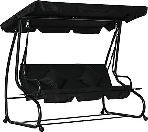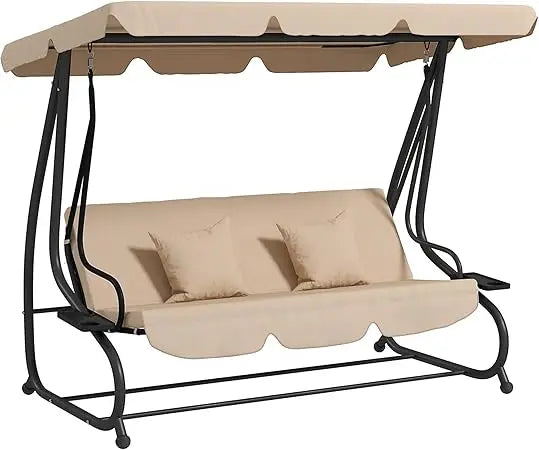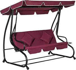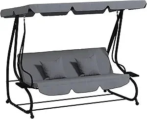 - Outdoor Porch Swing Bed: This cozy porch swing seats three adults and unfolds to convert into a covered outdoor bed. Sit and swing, lay down, and nap. Two pillows are included for padding and a place to put your head.