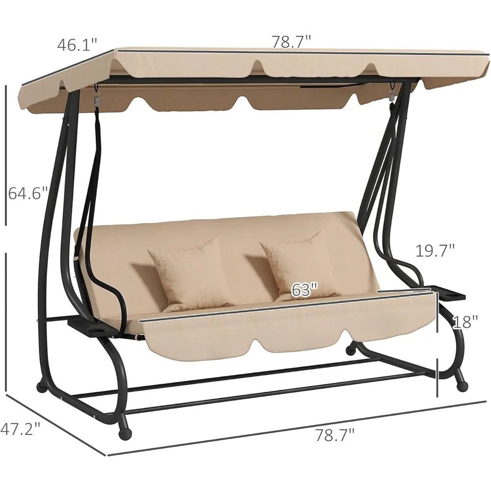 3-Seat Outdoor Patio Swing Chair, Converting Flatbed, Outdoor Swing Glider with Adjustable Canopy, Removable Cushion and Pillow