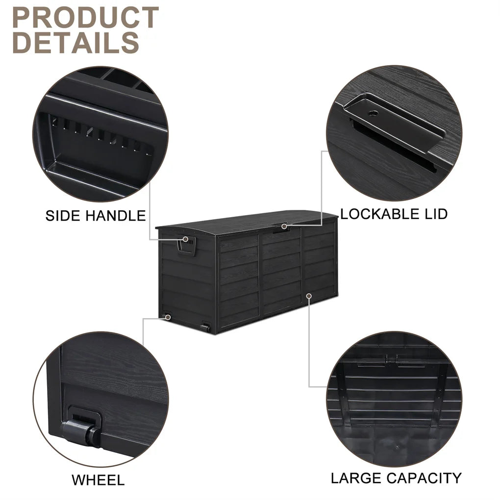 260L Garden Storage Box With Wheels - Formed in hard wearing and durable plastic which is water-resistant, weatherproof, and UV resistant, with a slatted wood-effect finish. Fully sealed design protects against insects and other pests