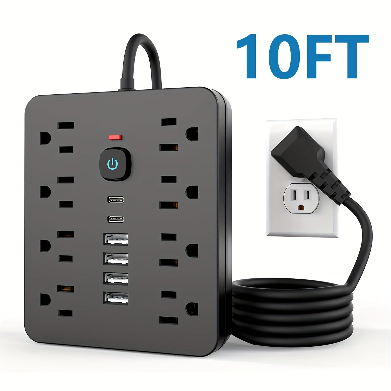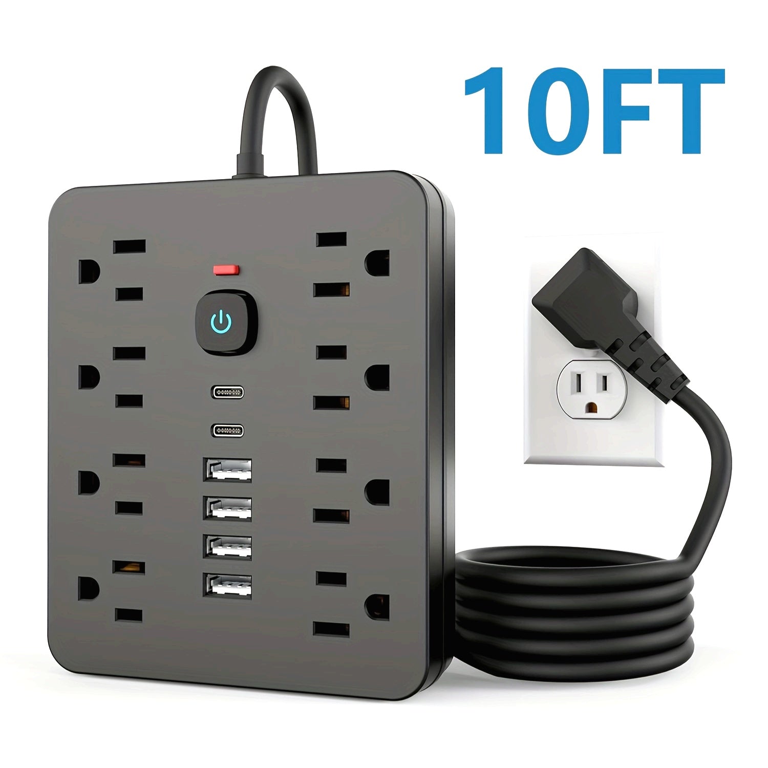 [Black Outlet Surge Protector] 14-in-1 Black Outlet with 8 Receptacles, 4 USB Ports, 2 USB-C Ports, 5/10ft Extension Cord, Flat Plug, Wall Mount, Overload Protection, Power Outlet Surge Protector - Ideal for Home and Office D
