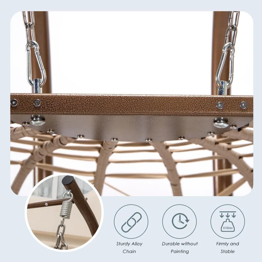 - STURDY & DURABLE: Designed for two person, our oversized double hanging egg chair offers an elevated swinging experience with its extra-sturdy, thickened metal frame and a remarkably supports up to 700 lbs; It's reinforced frame is crafted for stability and durability, available in elegant golden brown finishes that bring a luxurious modern touch to any setting