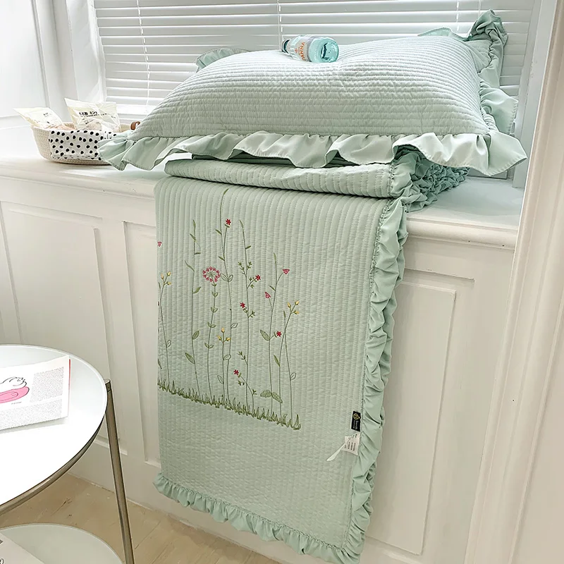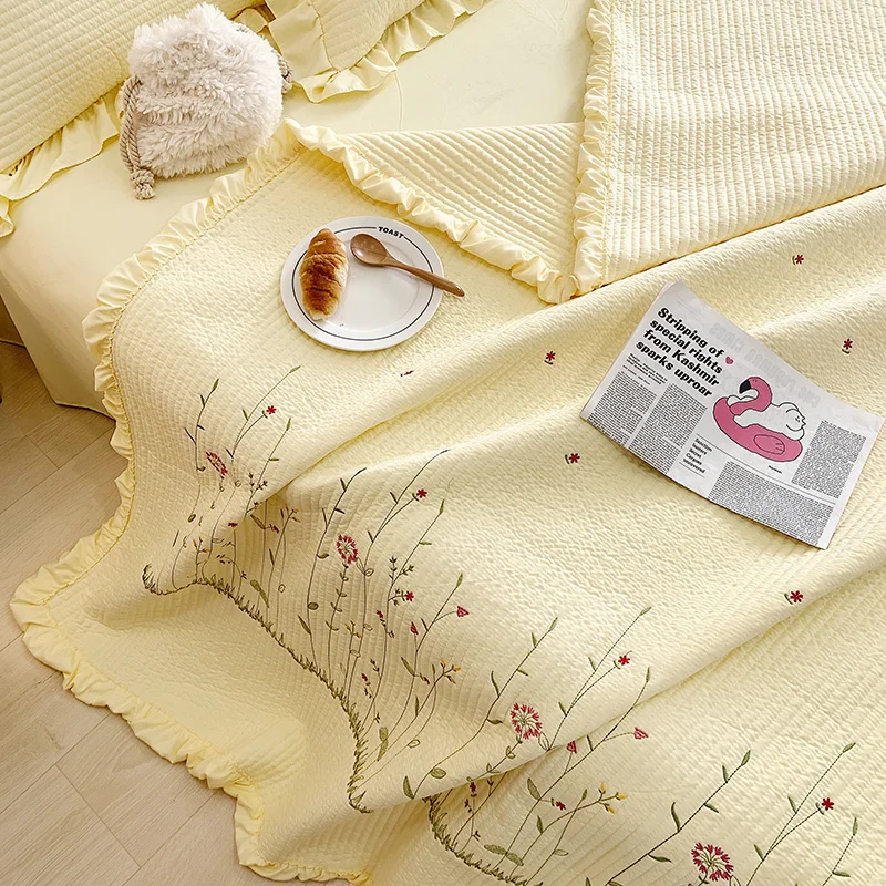 Fresh Flower Embroidered Summer Blanket 4/3/1 Pcs Ruffled Quilted Summer Quilt Set Machine Washable Lightweight Comforter Duvet