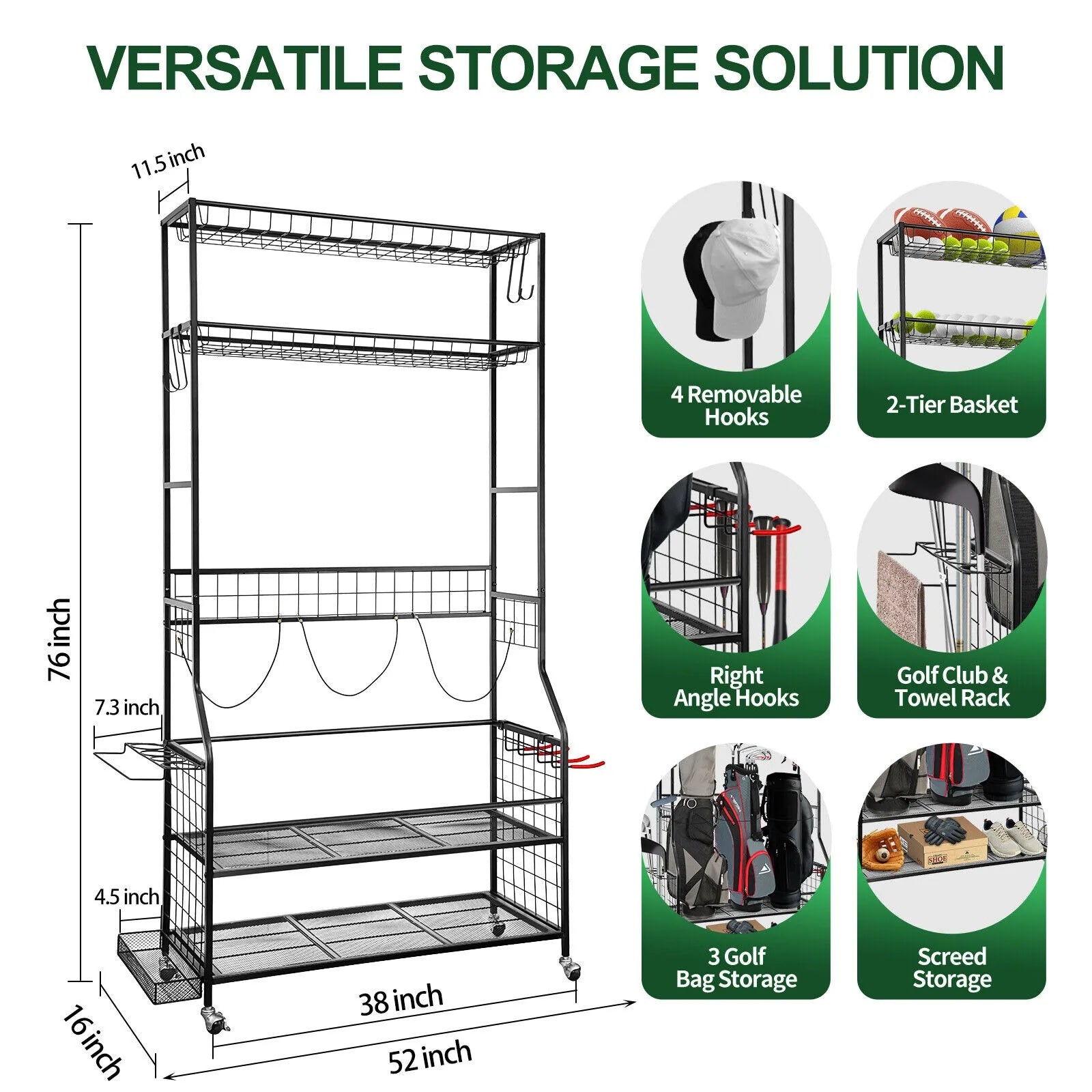 EXTRA LARGE GOLF RACK: All-in-one design 3 golf bag organizer. It comes with two tiers of baskets on top for store basketball, soccer, tennis, volleyball, golf ball, helmet and other sports equipment storage. Lower level with large storage space for golf accessories such as sports shoes or gloves. With hooks for hanging hats, sports backpacks and tennis rackets etc