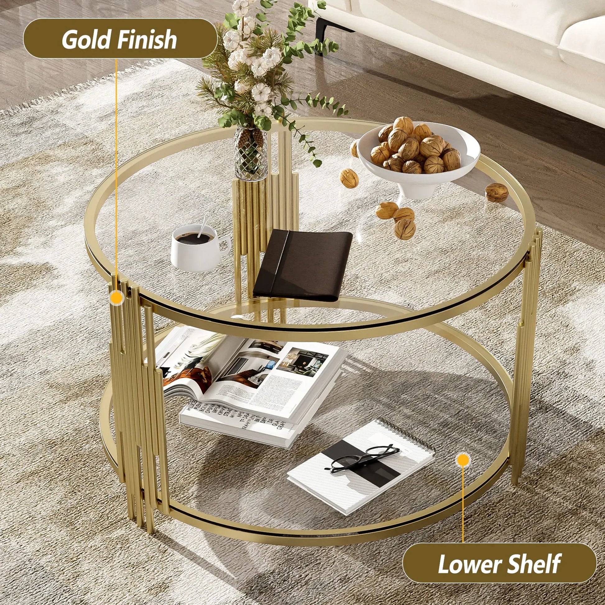 Modern Glass Coffee Table in 31.5", Asymmetrical Metal, Circular Metal Drum Base, Gold Finish & Lower Shelf,Café Tables