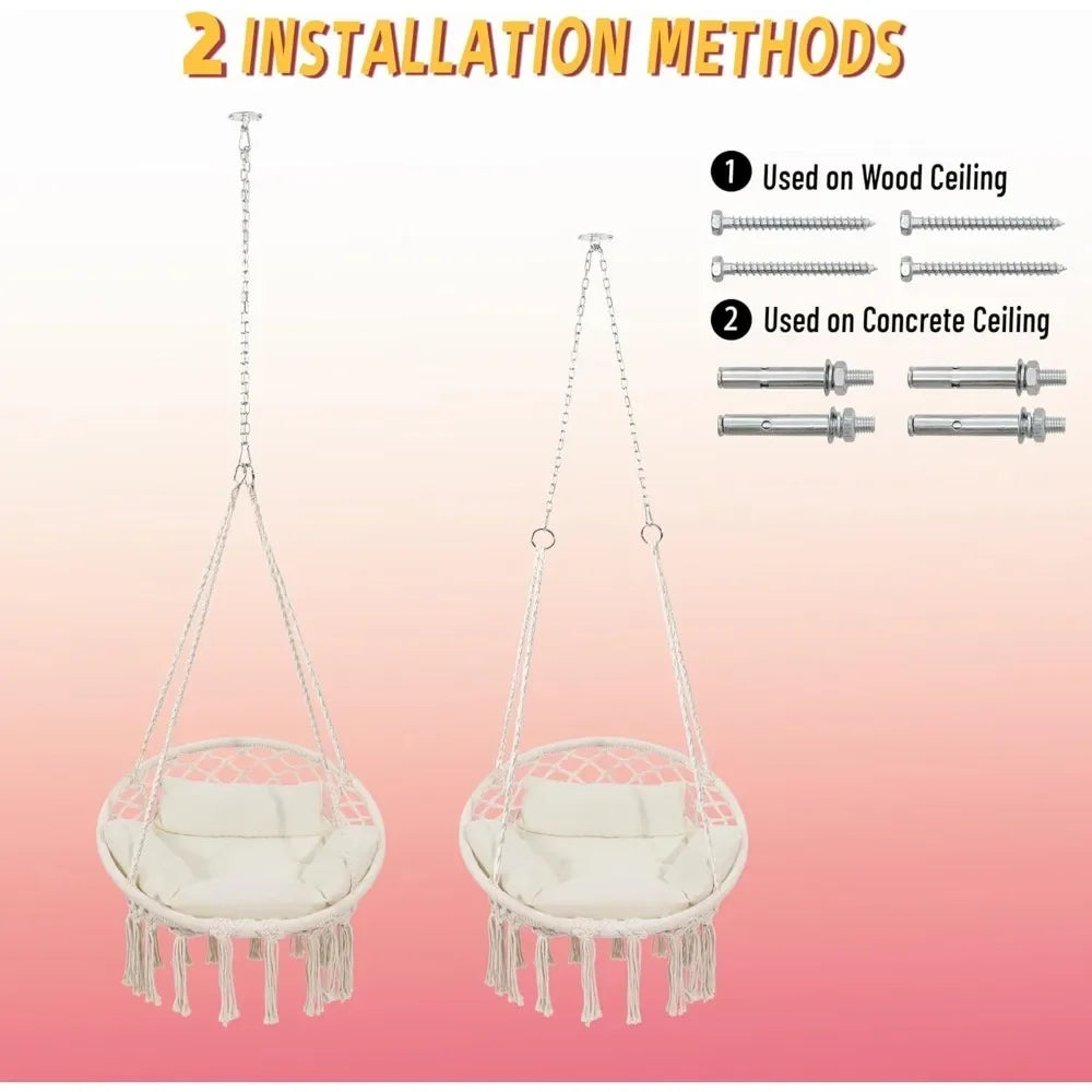 - 【SOLID STEEL FRAME】Our macrame hammock swing chair frame is a single piece of powder coated steel, unlike other products which require complicated assembly of the frame
