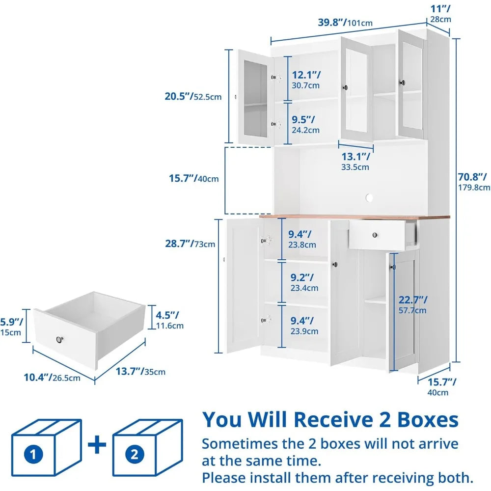- Adjustable Shelves: 71" Tall Kitchen Pantry has 6 doors, 6 fixed shelves, 1 drawer and 2 removable shelves with 2.5 inches of height adjustment, provide ample space to organize your books, towels, game cards, vinyl records, cutlery or more; The wide tabletop with deep enough for corner coffee bar, or hold decorations such as cups, CD player, vases, etc., making it a stylish freestanding storage cabinets