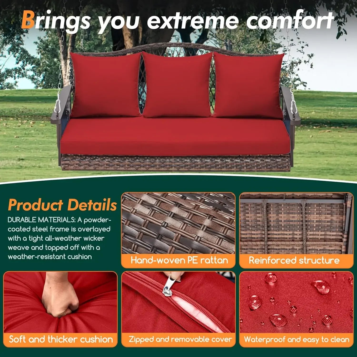 Upgraded Wicker Hanging Porch Swing Heavy Duty 900 LBS 3-Seat Outdoor Patio Swing Chair Bench for Adult w/ 8.9ft Hanging