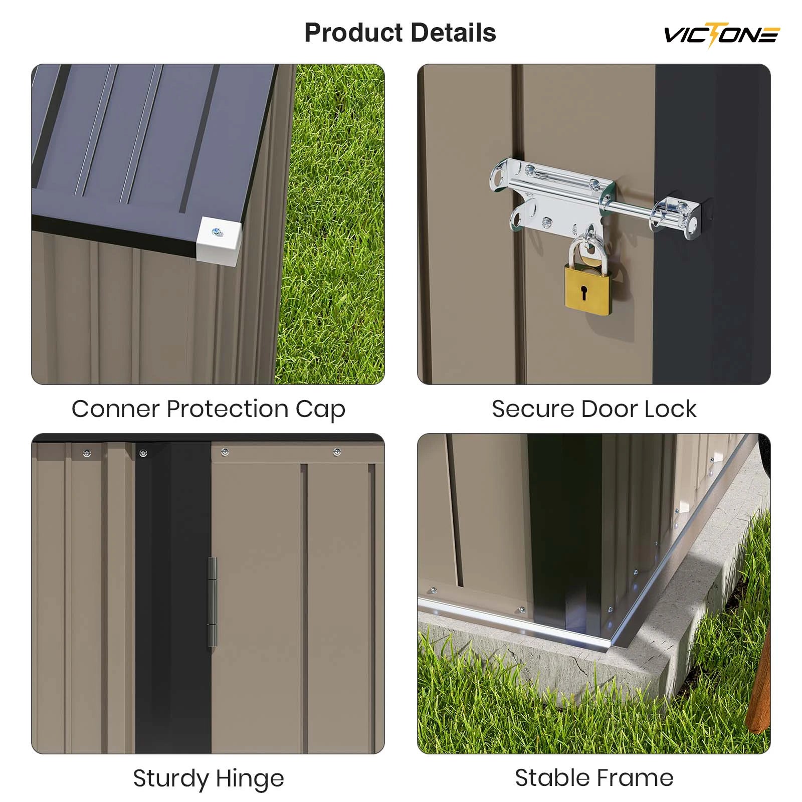 Durable Material and Stable Structure Its strong construction and the thick galvanized steel we used make this shed long-lasting, non-corrosive, and UV resistant. The overlapped wallboard is waterproof and moisture-proof, making it suitable for usage in all-weather circumstances.